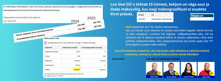 AGA “tippjuhte” on Loo Vesi OÜ-l lisaks vallavanemale veel 7 inimest, nendest 5 inimest reklaamivad ennast käesolevatel valimistel sloganiga “Parema Jõelähtme eest” 14 aasta jooksul ei ole vallajuht suutnud vee kvaliteeti tagada oma 7 liikmelise tippjuhtide armeega, ettevõte on võlgades aga proovime veel ????