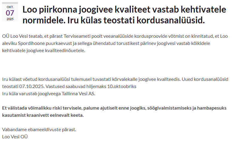 07. oktoobril 2025 andis Loo Vesi OÜ teada, et välistada võimalikku riski tervisele, palume ajutiselt enne joogiks, söögivalmistamiseks ja hambapesuks kasutamist kraanivett eelnevalt keeta!